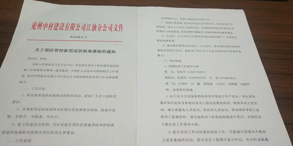 春節(jié)期間,一場突如其來的新冠病毒肺炎席卷全國,疫情防控形勢嚴峻。疫情就是命令,按照上級黨委要求,做出部署和安排,兗州中材第一時間成立由總經(jīng)理任組長的疫情防控領(lǐng)導(dǎo)小組,及時制定和啟動應(yīng)急預(yù)案,各分公司和項目部按照疫情成立了疫情防控組織機構(gòu),成立了疫情防控青年突擊隊,對所屬分公司積極推出疫情防控制度與措施,認真宣傳,抓好落實,嚴防死守,阻斷疫情傳播,切實做好疫情防控和復(fù)工復(fù)產(chǎn)等各項工作,切實保障員工生命安全和身體健康。針對當前疫情情況,分公司具體通過以下措施確保安全復(fù)工復(fù)產(chǎn): 一、分公司成立疫情防控領(lǐng)導(dǎo)小組,制定復(fù)工復(fù)產(chǎn)方案,分公司經(jīng)理任組長,領(lǐng)導(dǎo)小組按照當?shù)卣?/span>與公司要求,嚴格落實疫情期間的消殺管控及登記制度,并與當?shù)?/span>政府、業(yè)主加強溝通,將感染風(fēng)險降至最低。